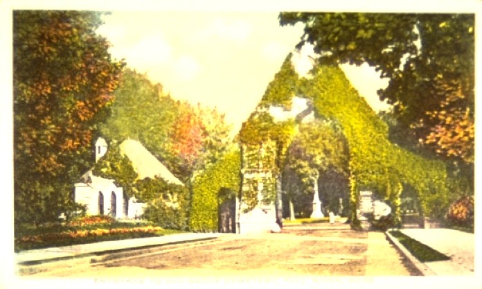 Postcards of famous resorts and exotic places are still available, but the period from 1900-1915 must surely mark the period when every little town or village was photographed as the subject for a penny postcard. Libraries, hospitals, landmarks, impressive buildings, homes of notable citizens, and even simple street scenes were all fodder for the camera. Millions of these little epistles were sent all over the country by visiting friends and relatives, some bedecked with glitter, some embossed and gilded, but most just plain scenes of faraway places to be shared with the folks back home. A few postcards of Oak Grove’s famous entry arch exist with the words, “The Shadows Have Fallen and They Wait for the Day”. The early cards show the gate without the clinging ivy. Oak Grove postcards are easily found in antique stores and on Ebay in the $4-$8 price range and are wonderful collectibles.