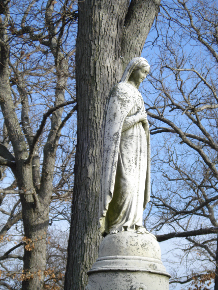 Oak Grove is a non-denominational city cemetery. The majority of burials here could be classified as Protestant-affiliated. Saint Patrick’s cemetery in the north end of the city as well as several Roman Catholic church cemeteries within the city contain the remains of most of the city’s Catholic population. So it is not surprising that saints, angels and crosses are very few within the walls of Oak Grove. Tablet-shaped stones and obelisks are the favored shapes to be found, even among the stones from the 1855-1900.